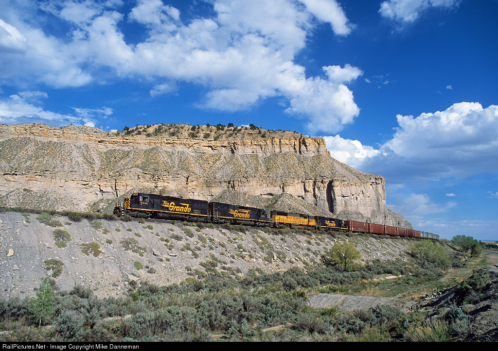 Rounding the broad curve leaving Maxwell, Utah, is Union Pacific’s LJP45 “dirt train” on a pretty May 4, 2004. On this day, three Rio Grande “Tunnel Motor” SD40T-2s bracket a yellow SD60M as power on the local out of Helper returning from East Carbon on the Sunnyside Branch.