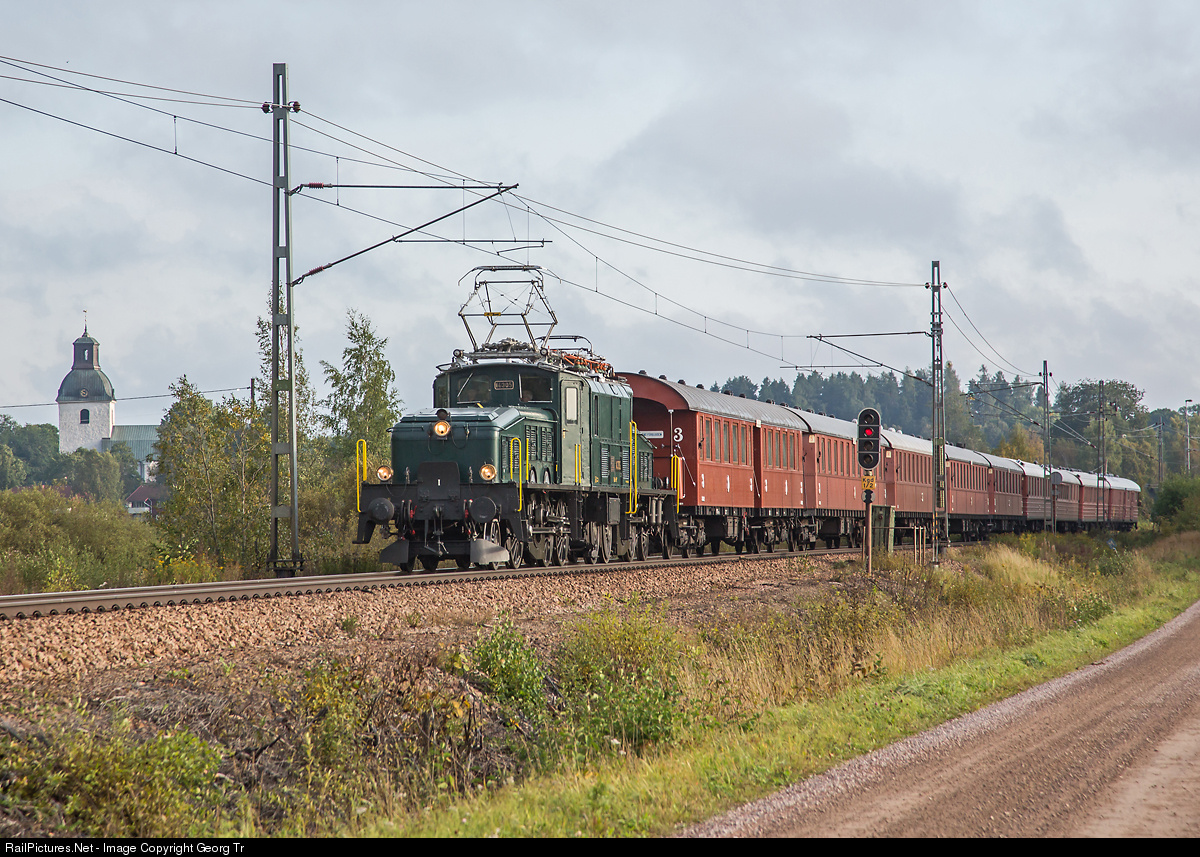 | "Crocodile" Ce 6/8 III # 14305 of SBB Historic, on visit in Sweden during the event of celebration of 100 years after first railway electrification, is pulling a long rake of historic swedish cars from Gävle to Avesta Krylbo, near Kungsgården. On the pantograph, a wider contact shoe (1800 mm instead of 1450) is fixed for the swedish overhead system. |
