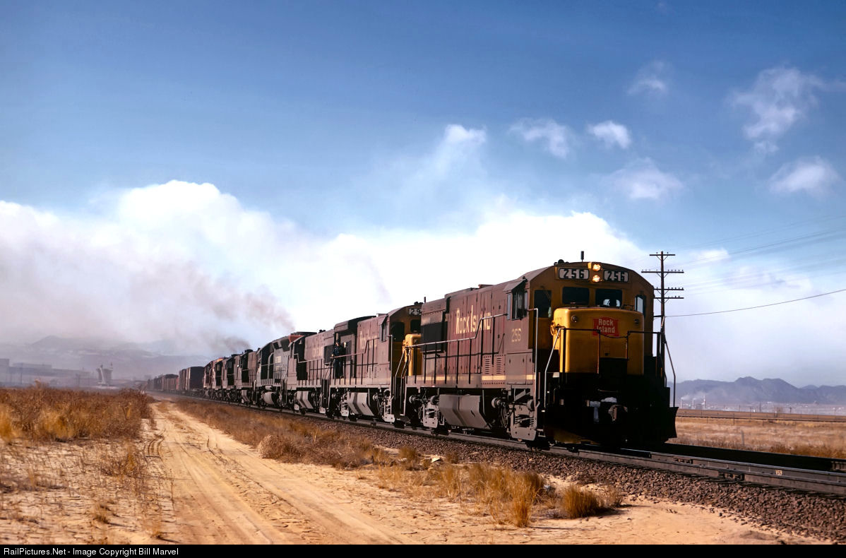 Brisk north winds scatter dust and exhaust as Rock Island train 82 begins its daily eastbound trek out of Denver for Blue Island, Illinois. U28B 256 leads eight hard-working units that including an almost-new Rock Island U33B and a Southern Pacific SD45. We’re at Havana and Smith Road, east of the airport, standing alongside Union Pacific’s Kansas line, which gives Rock Island access to the Mile-High City. The surrounding fields, habitat of jack rabbits and rattlesnakes, are bare now, but come back in, say, 2015, and you’ll see a high-rise hotel, sprawling suburbs, and construction of a brand new light rail line, part of Denver’s growing RTD system.