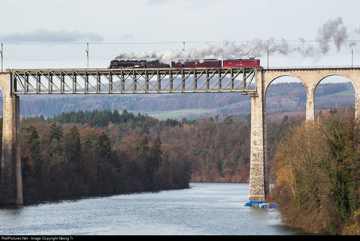 | Transfer run of the Baldwin built former French Railways "Mikado" 141 R 568 with her tools and staff car (a former french postal car) and Re 4/4 I 10009. The privately owned steamlocomotive run from the previous base in a shed in Schaffhouse to her new temporary home in Vallorbe (Swiss-France border station). The train is crossing the Rhine viaduct in Eglisau.