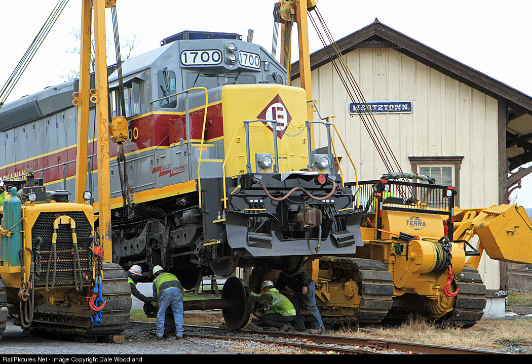 NS Erie-Lackawanna Heritage locomotive #1700 suffered a traction motor failure which was addressed on the Atlas Chemical siding in Mertztown, Pa. Terra Railroad Services lifted the locomotive to put a temporary wheel set enabling the locomotive to be moved to a repair shop.