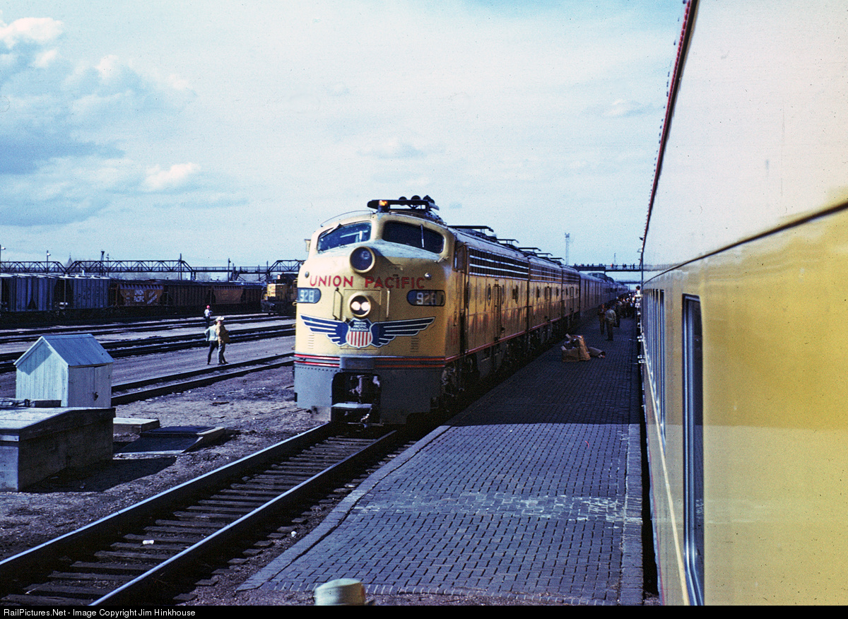 From the window of an 8444 Excursion Special in probably 1968, an eastbound UP passenger train, either the City of Portland or, due to its length, maybe the City of Everywhere combined Cities train. An SD40 pokes its nose out further left, and also notice all the watchers on the walking bridge (which is still there) in the distance.