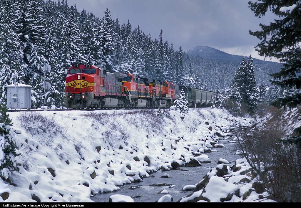 On April 12, 2001, an eastbound Burlington Northern Santa Fe manifest freight is about to take down the signal at West Cliff, Colorado, on a snowy Moffat Tunnel Subdivision. Even though the red paint on lead warbonnet-clad Santa Fe Dash 9 No. 610 has been partially touched up, it still looks good among the snow-flocked trees at Pinecliffe this spring day! Besides No. 610, the colorful locomotive consist includes Heritage I and II Dash 9s, a BNSF EMD SD75M and a BN EMD SD40-2.