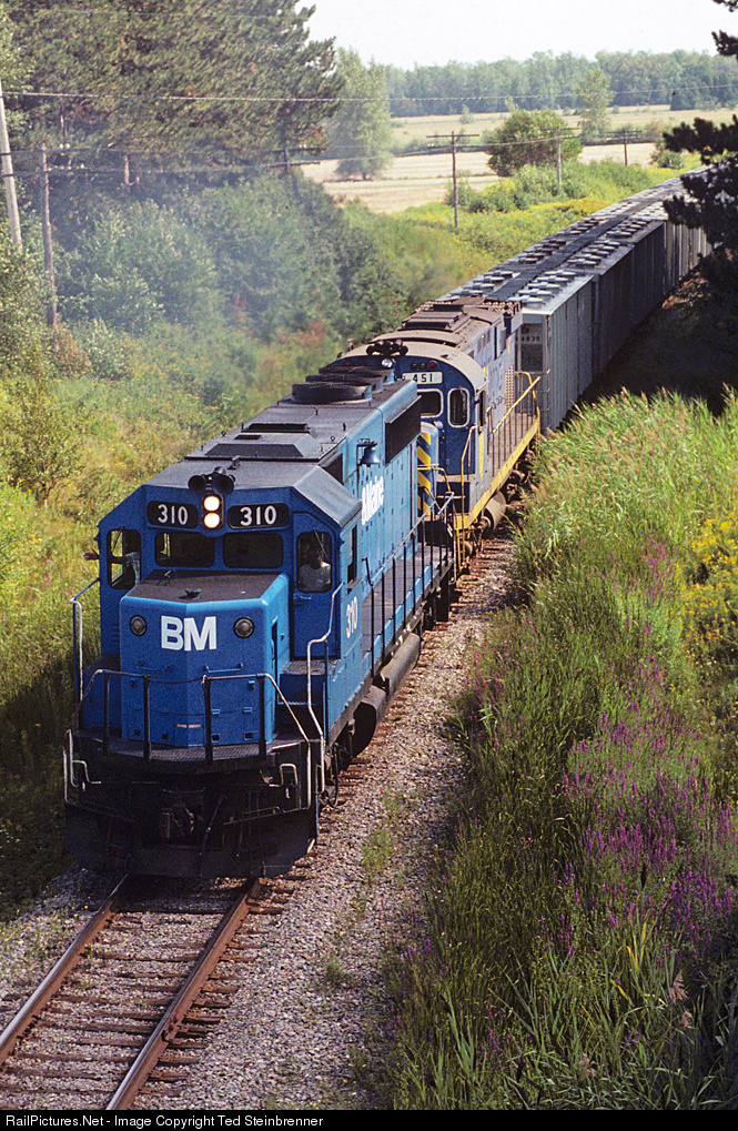 B&M GP40-2 310 leads D&H C424m 451 on a Guilford-era D&H northbound at Burtonville, PQ on its way to the CP connection at Delson and, then, St. Luc Yard in Montreal. Their Guilford years long behind them, these locomotives continue in operation today, 310 as CP 4652 and 451 as LA&L 424.