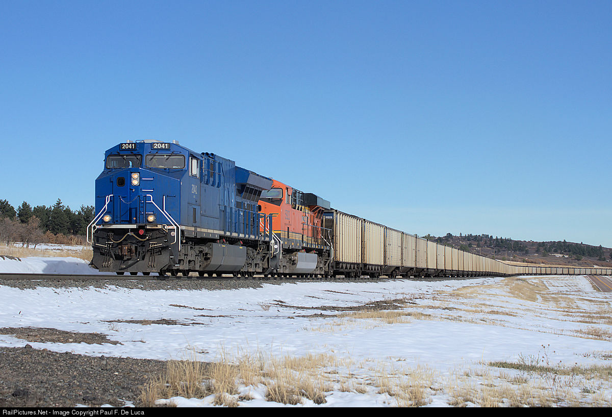| GE Tier 4 demo's have been turning on a BNSF coal set seen here on the Joint Line. In addition to the unit on the point, there's another blue demo shoving on the rear. |