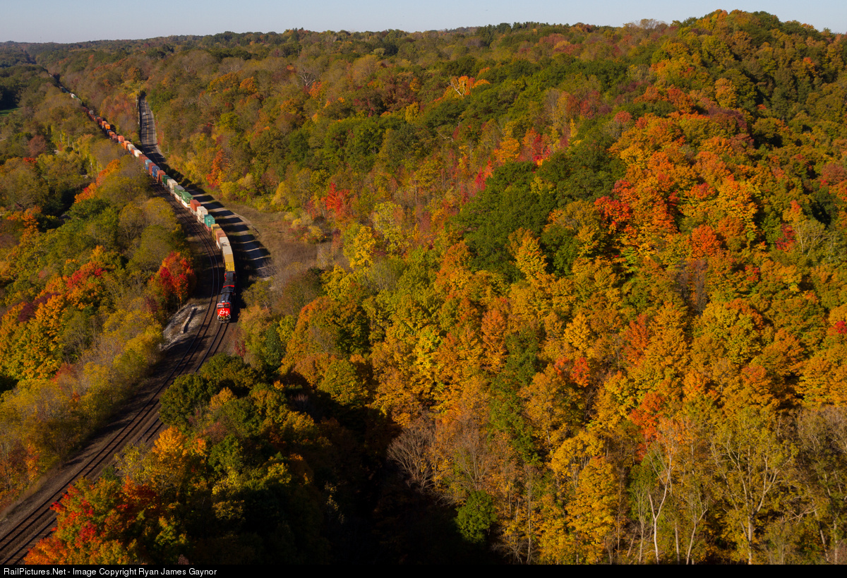 One of the freshest faces on the CN roster glides downgrade with train # 148 while Dundas displays all of its autumnal glory.