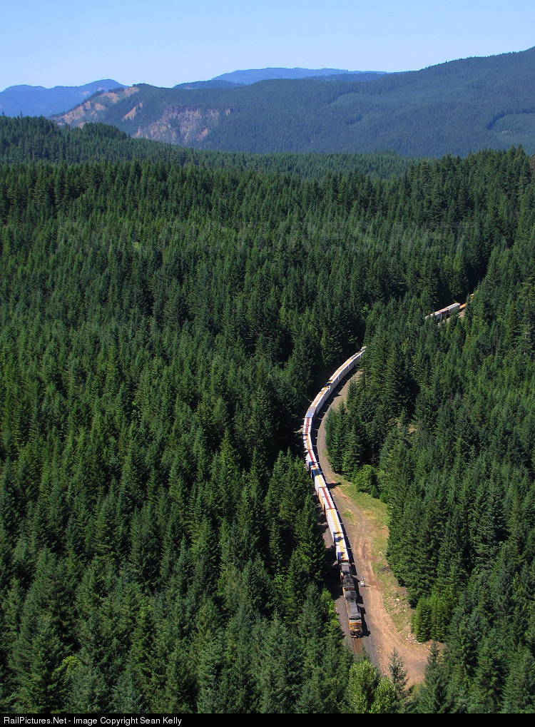 From a precarious perch above Tunnel 15 deep in the Oregon Cascades, a friend and I beheld the sights and especially the sounds of railroading on the ex-SP Cascades Crossing. We listened to three consecutive southbounds work up the grade through McCredie Springs across the valley, around the lower loop above Heather, and finally right below us between Wicopee and Fields. The 3-train-fleet met one northbound at Fields which had to wait over two hours since neither Wicopee nor Heather was long enough to facilitate the meet. Seen here is the second of the three southbounds with the DPU's shoving hard to keep the heavy Oregon lumber moving against gravity.