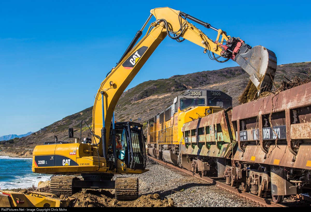 | Removing the soil from the area where the rock for the seawall extension will be placed into the dump cars. Restoring the property in the never ending battle against the sea.This section of Emma Wood State park has soft soil with is very susceptible to erosion. Union Pacific is extending the rock seawall as the soil erodes away. |
