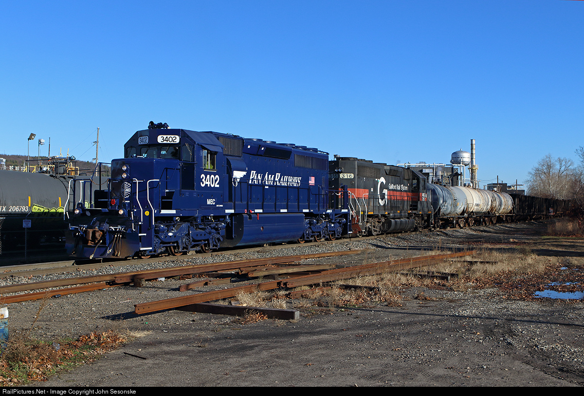 Pan Am recently received 5 GATX owned SD40-2's in fresh Pan Am paint. One of them leads an old Guilford painted unit, MEC 316, into Rotterdam Jct with the East Deerfield, MA to Rotterdam Jct. mixed freight. This is the western end of the former B&M and an interchange point for traffic moving to CSX.