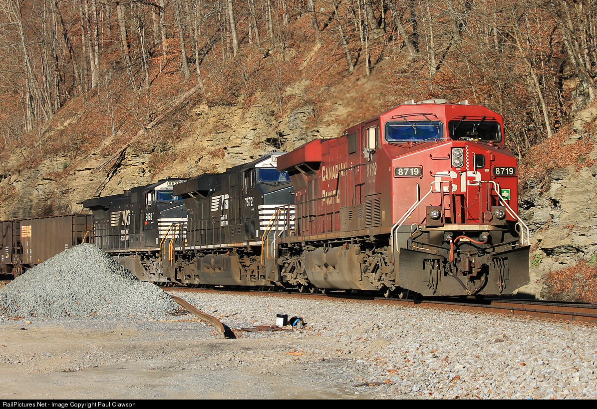 | CP 8719 continues slowly east at Argo at the Kentucky Virginia state lineand will stop shortly to wait on a loaded coal train. then 859 will proceed to Hurley, VA. it will have to tie down at Hurley and wait for additional power before going to Weller yard the 2 NS units are dead in tow behind the CP. |