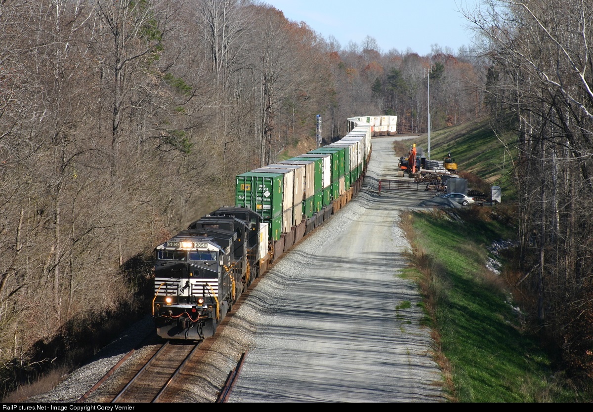 NS Train 218 negotiates a temporary alignment around track construction on the NCDOT Rail Division "Bowers to Lake Double Track Project". This project, part of the "Piedmont Improvement Program", constructs 4.2 miles of double track in addition to two roadway grade separations to increase rail capacity and improve safety. This location will be a new control point, called CP "Lake", consisting of a double No. 24 crossover on concrete ties allowing passenger trains to cross from one track to the other at 60 mph. The temporary alignment is needed to allow crews to build an asphalt layer and half of the crossovers in the location of the former single track.