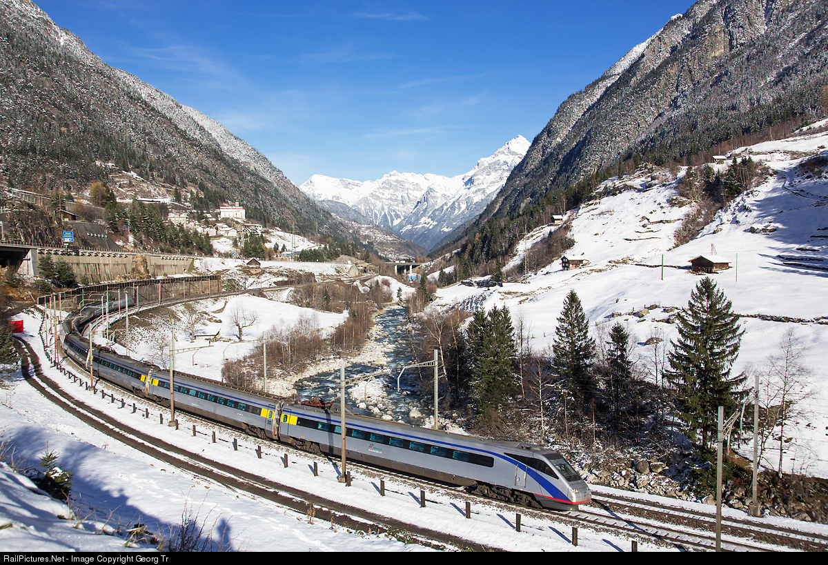 | Only a few days remain, then the tilting trains ETR 470 will disappear from the Gotthard line. The trainsets owned by the SBB were withdrawn since spring and 3 of them are scrapped already. The trains of Trenitalia will run only in Italia in the future. ETR 470 008 of Trenitalia is running as Eurocity 14 from Milan to Zürich through the Wattinger curve near Wassen. |