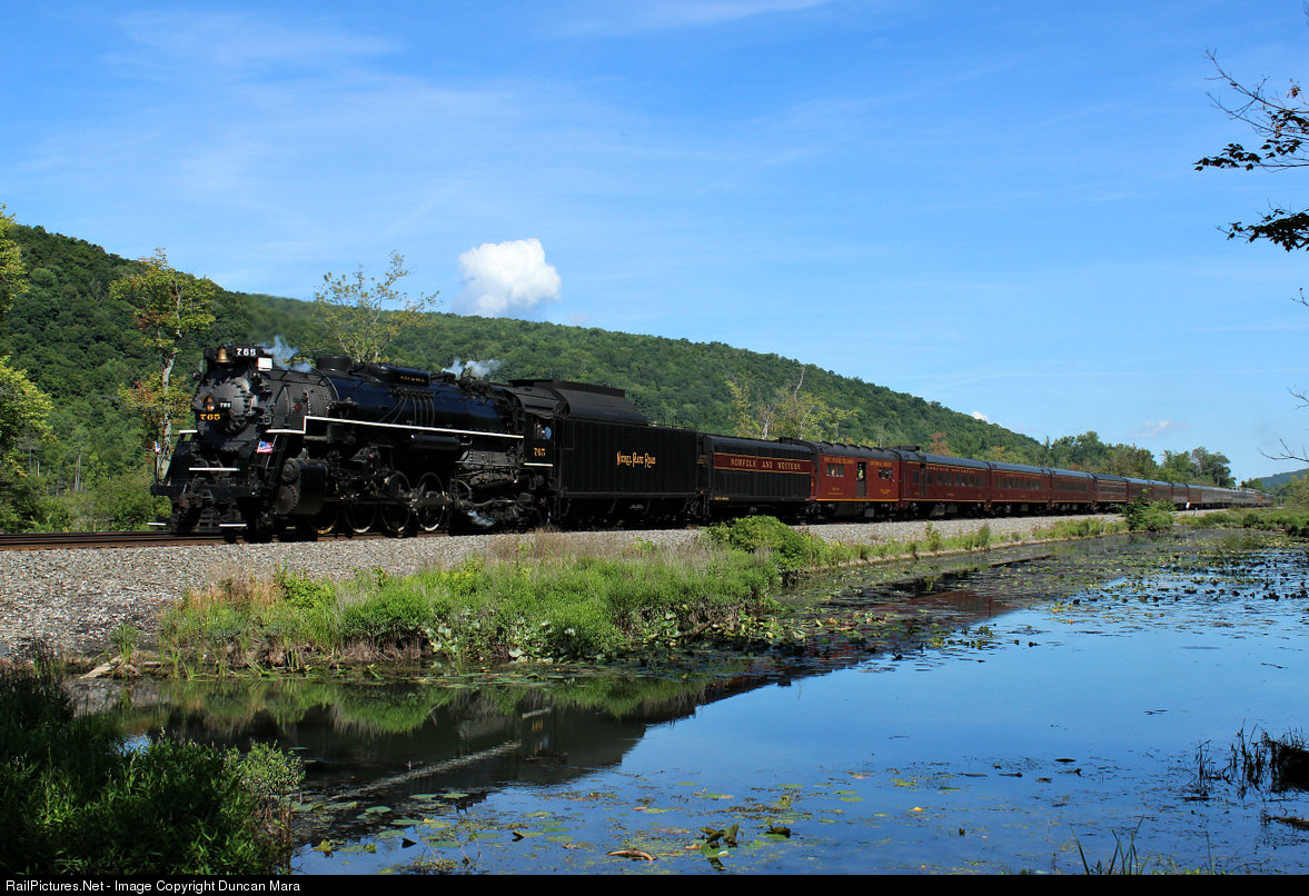 | NS 957 better known as the "Erie Limited" is seen traveling east on the Ex-Erie Southern Tier mainline at Swain, NY with NKP 765 leading the way. This had been the first time since the 80s that steam had made an appearance on this part of the tier so it was quite an event. |