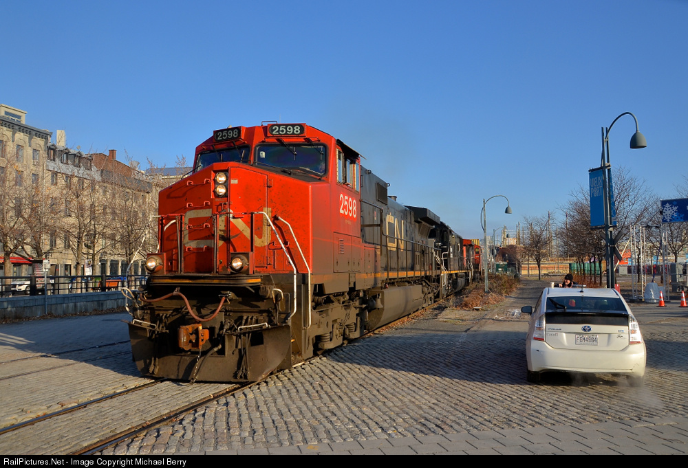 | Past Port of Montreal security. CN 149 has just left Port of Montreal trackage and is on the CN Wharf Spur as it passes a crossing that is flagged by a Port of Montreal employee. The Port of Montreal security flags the many crossings in this busy and tourist-intensive area. Lashup is CN 2598, IC 1001 & CN 2631. |