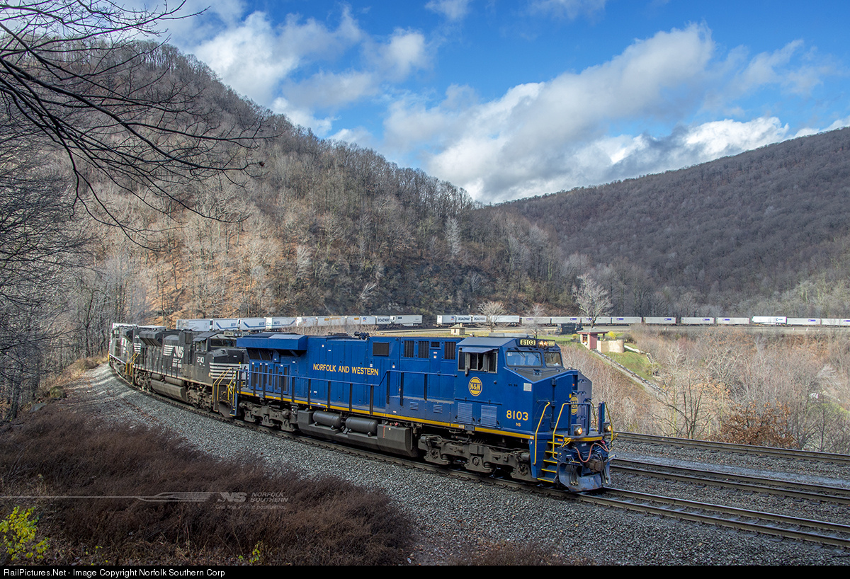 The Norfolk and Western heritage unit, GE ES44AC number 8103, leads intermodal/van train 21J uphill around track three at Horseshoe Curve near Altoona, Pennsylvania. Photo by Casey Thomason. For more information about Norfolk Southern, visit www.nscorp.com