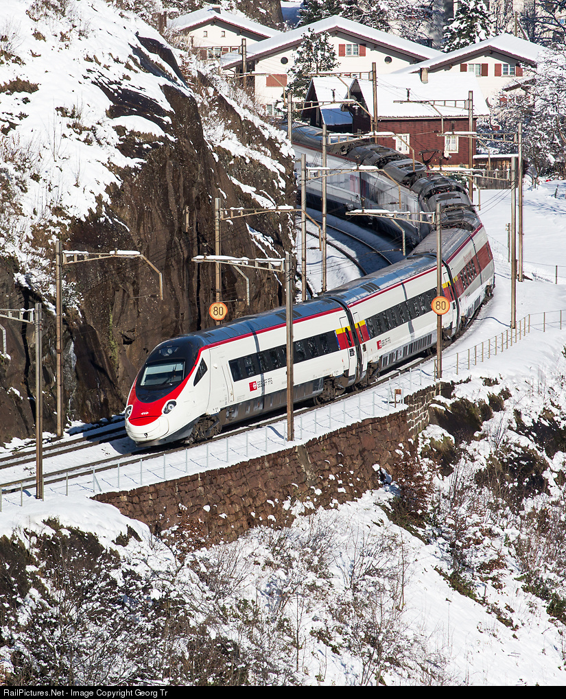 | Tilting train RABe 503 of the SBB is leaning in the 300 meter radius curve of the Gotthard line below Wassen, running as Eurocity 17 from Zürich to Milan. |