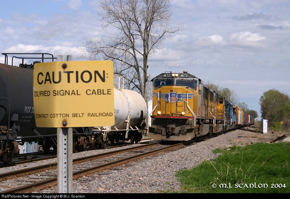UP 4672 moves through West Memphis on the old Cotton Belt RR track just like the sign says.