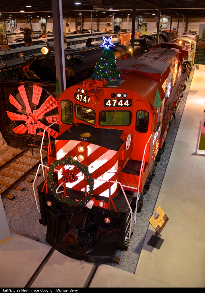 A one of a kind MLW, ready for Christmas. CP 4744, the only MLW M640 ever built has been decorated for Christmas for the first time this year at Exporail. At left is rotary snowplow CN 55361 , also built by MLW (in 1928).