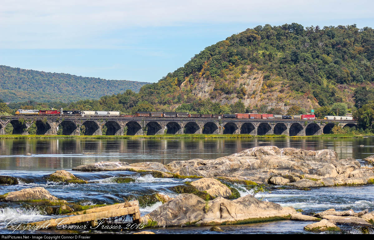 A NS manifest heads off of the Buffalo line onto the Rockville Bridge before going into Enola yard with a colorful lashup of engines