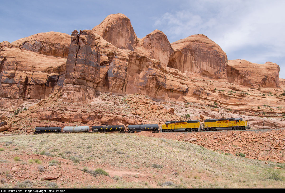 | UP's Potash Local returns northward from the mine with four empty tank cars from Crescent Junction. Due to the Memorial Day holiday, no potash loads were pulled from the industry, but it does not lessen the impressive scenery along this very unique line. |