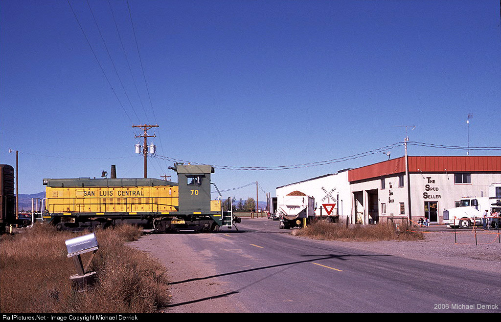 The name of the business says it all for this shortline: "The Spud Seller." The San Luis Central derives much of its business from the potato farms lining this agricultural branchline between Monte Vista and Center, CO. Built in 1952 for the Cincinnati Union Terminal, and after a stint helping make beer for Coors, SW8 #70 now helps bring baked potatoes to our dinner tables. A sharp eye will note this unit sports her original single note horn, and has an added Airchime K5LA. A light pull on the cord gets the single note and a bit of Airchime, while a full pull gets a 6-chime monster that is something to hear.