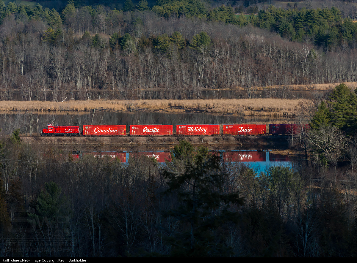 | Making a northbound run from Saratoga Springs to Rouses Point to finish the US/New York portion of the 2015 Canadian Pacific Holiday Train launch, the 01H-27 is seen crossing a Lake Champlain causeway at Clemons, New York. Anyone interested in a tree trimming venture? |