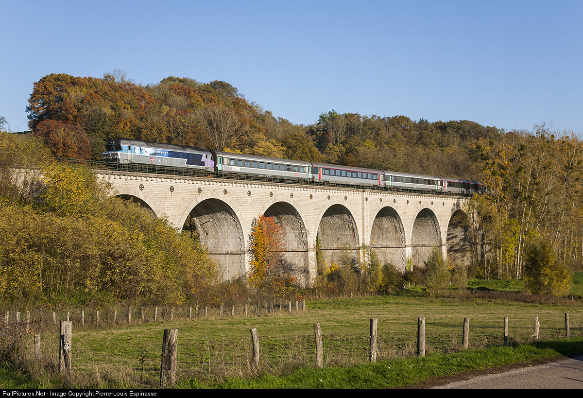 The Intercity Belfort to Paris Est crosses Hortes viaduct.