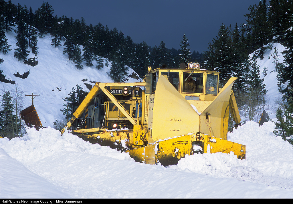 Rio Grande spreader AX-41 moves snow off the right-of-way just west of Pinecliffe, Colorado, on March 21, 2003. The spreader is powered by Rio Grande GP40-2 No. 3100 and Union Pacific GP60 No. 1900 (former D&RGW No. 3154). A major blizzard hit much of Colorado on March 17-20, 2003. Denver received 31.8 inches, while Coal Creek Canyon got 71.8 inches and Rollinsville 87.5. With Pinecliffe located between the two, it received a whopping 6 to 7 feet of heavy, wet snow!