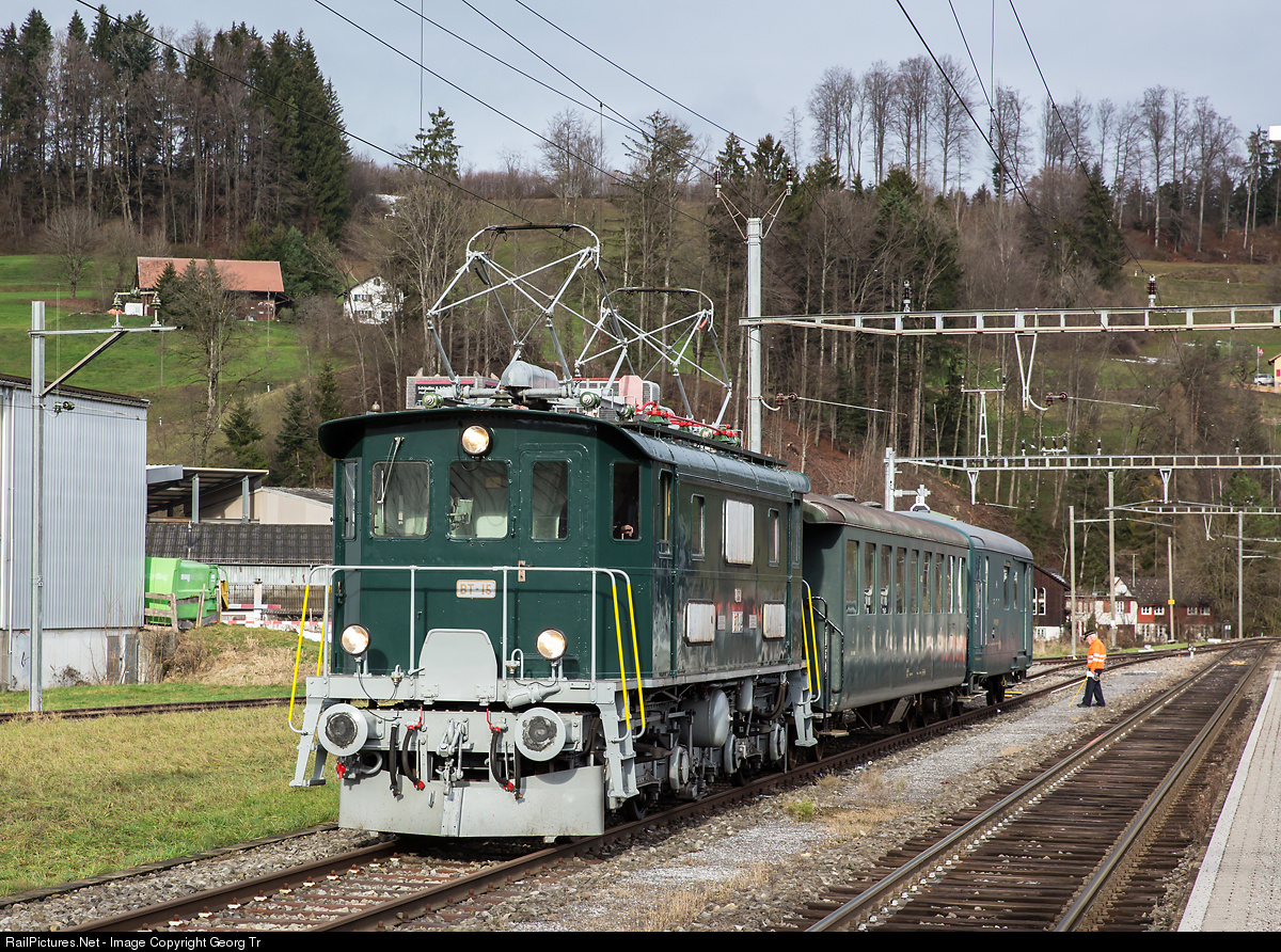 | Former Bodensee-Toggenburg-Bahn locomotive Be 4/4 # 15, now running for the Dampfbahnverein Zürcher Oberland /Steamtrain association Zürcher Oberland (DVZO), is ready in Saland with a privat charter train to Wald. The cars are former Seetal Bi 55 85 28-03 010-6 and postal car Z 55 85 92-29 609-6 of association "Verein Seetalwagen" (STW), now belonging to Slm Gmbh. |