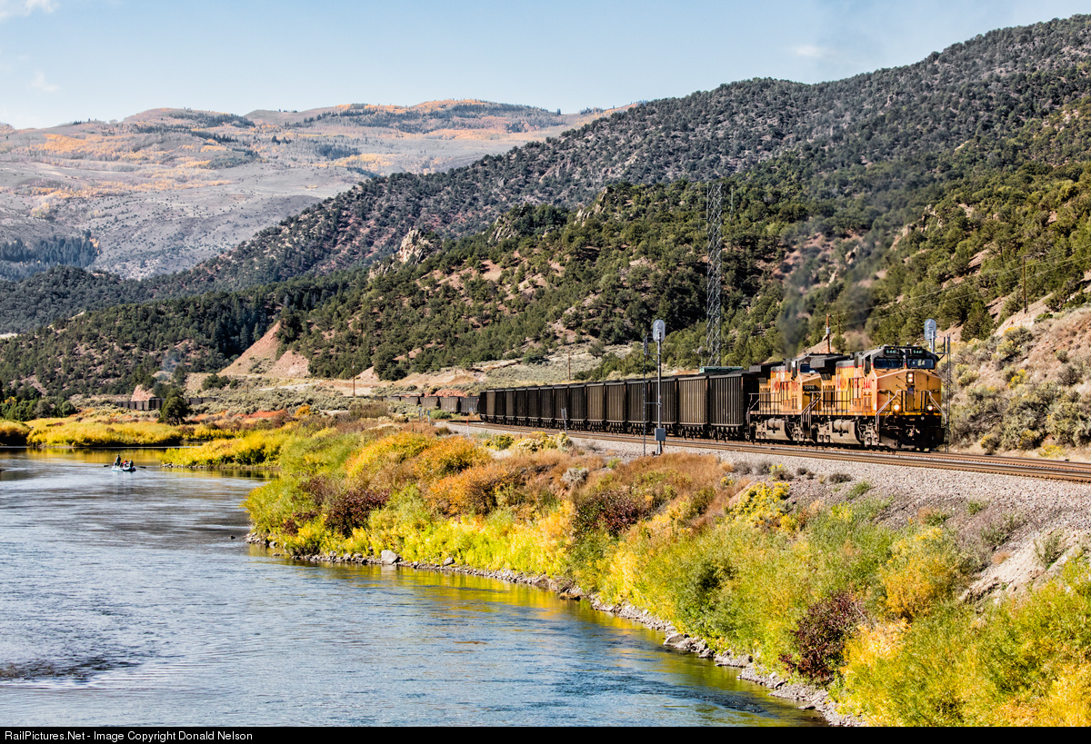 | UP 6641 and 7098 leave Yarmony after waiting for the passing of Amtrak westbound. Willows along the river are putting on a great show, with the Aspen on the mountain behind already past peak. Coal out of Phippsburg is getting scarce now on the Moffat - not like back in the 1970's and 1980's. |
