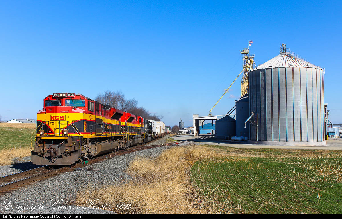 | The Norfolk Southern Lurgan Branch offers an abundance of foreign lashups and unique photo props throughout the line in PA and MD. Here, westbound NS 211 with a KCS leader passes one of the serviced grain silos at Shippensburg, PA |