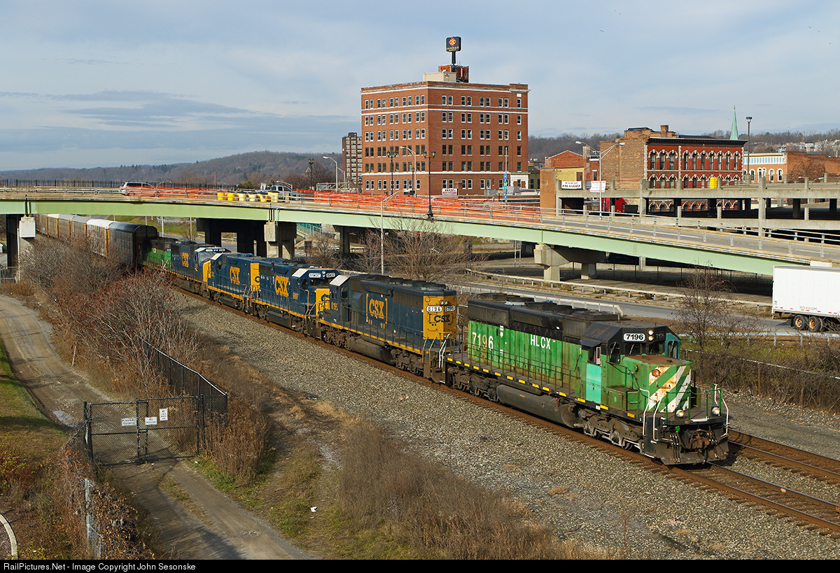 Two former Burlington Northern SD40-2's that retain their original (as built in 1979) road numbers bracket 4 CSX EMD's on an EB autorack train. Former BN 7196 with its large BN road number leads CSXT 8196 (SD40-2), CSXT 6907 (GP40-2), CSXT 2311 (ROAD SLUG), CSXT 4569 (SD70MAC), HLCX 8169.