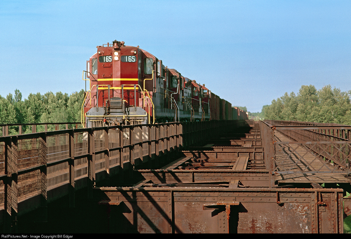 DMIR 165 leads a quartet of SDs on a manifest freight west across the unusual Interstate bridge that connects Oliver, WI to Steelton, MN. The two level bridge handles rail traffic on the top and highway traffic below. Note that the bridge was designed for double track, but also note the cut girders in the foreground. These were removed in the 1970s and used to build a new bridge over US 53 near Virginia, MN for entry into Minorca's new taconite plant. The Interstate branch gave DMIR connections with CNW and SOO as well as BN, and is now part of CN's mainline to Chicago.