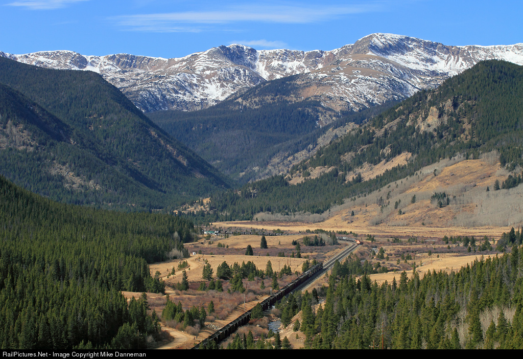As a Union Pacific coal train slowly proceeds westbound on the main, an eastbound BNSF manifest freight meets the train in the siding at Tolland, Colorado, on October 22, 2012. Some early snow accents the Continental Divide in the background. Toward the middle of the photo are two faint lines in the trees—these are survey lines used when locating the 6.2-mile Moffat Tunnel built 1923-1927. A good deal of the survey work was done at night with powerful lights at both portals and at the mountain summit being used as targets. Trees in these sight lines were removed, hence the lines.