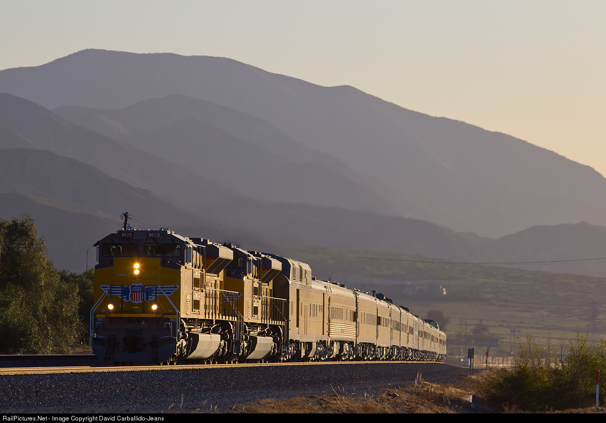 | Two of Union Pacific's newest SD70AH locomotives are pulling a seventeen car long passenger special towards the summit of Beaumont Hill, near Banning, as the sun begins to rise and warm cool air on a mid March morning. |