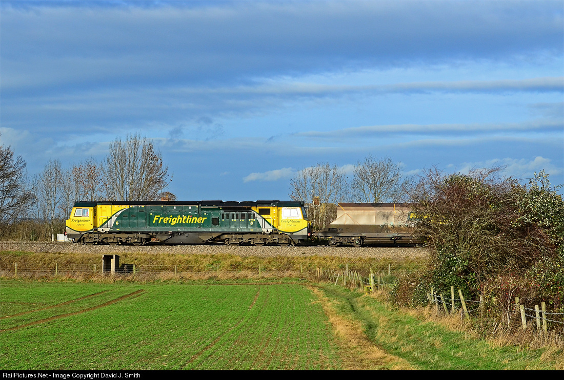 | A short burst of December sun catches Freightliner Class 70 No. 70010 passing Churchdown with a rake of empty coal wagons from Rugeley Power Station to Stoke Gifford Sidings (Bristol). |