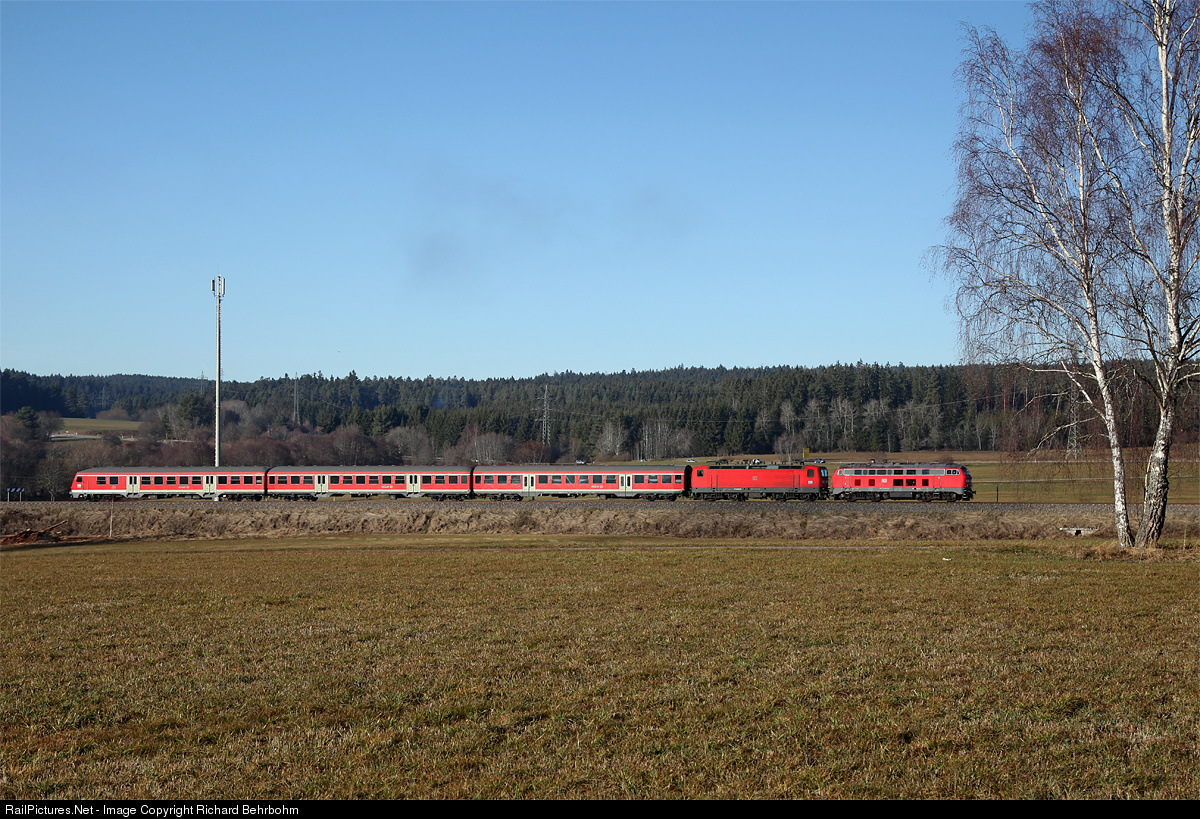 | Electric locomotive 143 640 is pulling a special train from Freiburg (Breisgau) on the Höllental (Valley of Hell) Railway to Donaueschingen. A diesel engine 218 leads the train between Neustadt and Donaueschingen, a line in the Black Forest without catenary. |