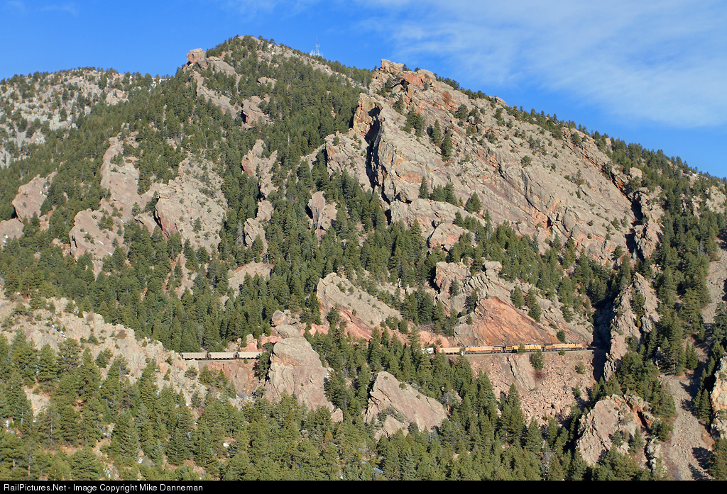 A westbound Union Pacific coal empty threads the Flatirons west of Plainview, Colorado, on the morning of February 28, 2011. The rear of the train is still exiting Plain and passing through Tunnel 2, while the power is about to plunge into Tunnel 3.