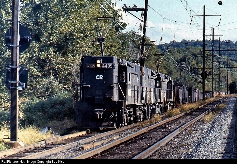 Westbound tripleheaded E44s climb the grade off the Port Road to switch onto the Enola Branch. Today, the Enola Branch is gone east of here, and a public rail trail parking area is located about where the 4405's caboose would be in this photo. The 4405 was built by General Electric for the Pennsylvania Railroad in February, 1961.