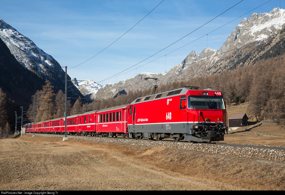 | Ge 4/4 III # 648 "Susch", the only in the beautiful red RhB paint scheme, pulling RE 1125 from Chur to St.Moritz in the Bever valley. In the rear 4 panorama cars of the Bernina Express, going to Tirano. |