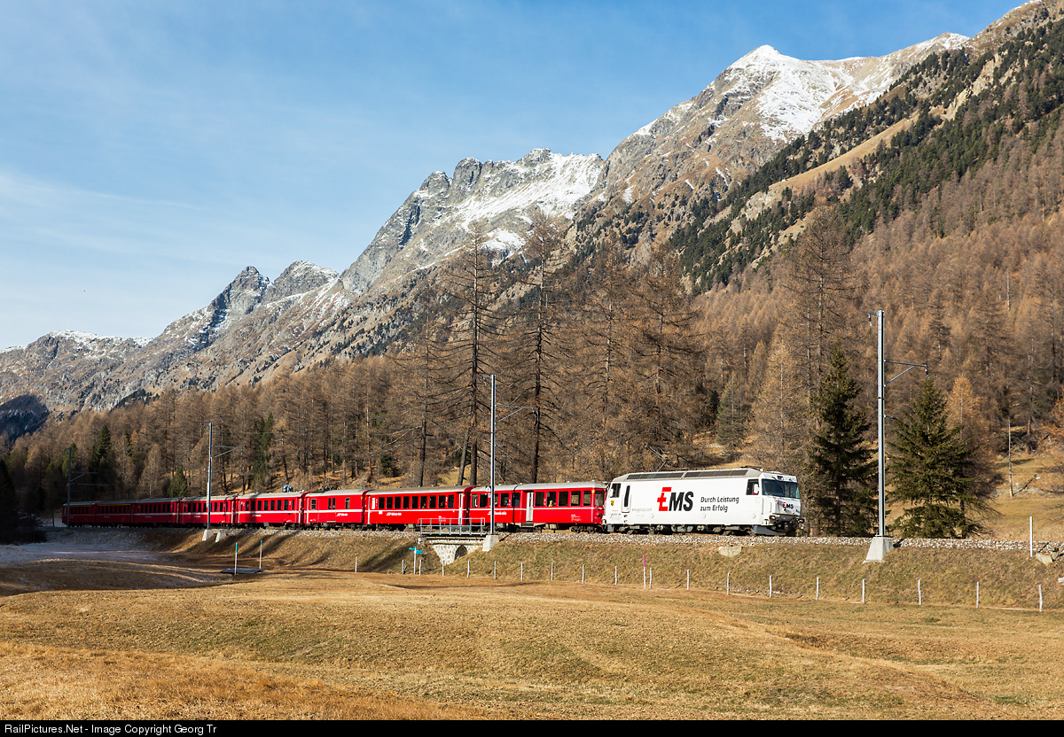 Ge 4/4 III # 643 "Vals" with EMS publicity paint scheme is pulling RegioExpress 1129 Chur-St.Moritz through the Bever valley.