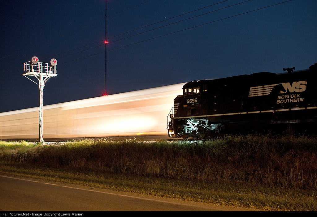 Two Norfolk Southern trains make a meet at "Midway" siding on the railroad's Brooklyn District, as part of the Illinois Division, on August 27, 2015. The NS 2696 is holding the main with northbound NS 32Q, originating at the Alton and Southern Gateway Yard in East St. Louis bound for Decatur, while at left, dunking into the siding is southbound NS 181 that originates at Oakwood Yard in Melvindale, Mich., destined for Luther Yard in St. Louis. MARCH 2017 EDIT: The late-80s bracket signal mast and the searchlights have been retired from service.