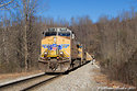 K221 is rolling southbound approaching the "Pusher Shack" in the small hamlet of Morley, TN, behind a matched set of UP 5900 series GEs. CSX keeps a manned helper stationed here to assist trains over Duff Mountain. However, the crew of this train politely declined the offer of help from the pusher crew, as they had the train well under control. With the severe downturn in the coal business lately, I was actually excited to see what I assumed could only be a coal train here. Only later did I find out this is actually a coke train, and not coal. That also explains why the crew didn't need the help of the pusher, as coke is much lighter than coal.