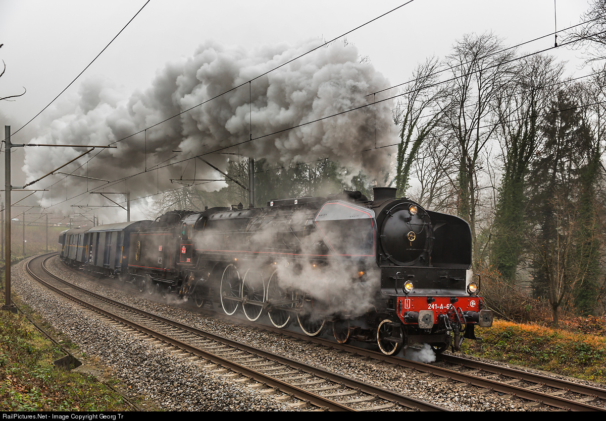 | A steam train with the large former french railways 4-8-2 "Mountain" 241 A 65 made a visit in Konstanz for the christmas market. The four cylinder compound express train locomotive, built by Fives/Lille in 1931, is tackling the 1.2 % grade from Turgi up to Baden. |