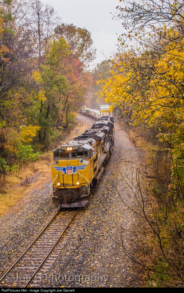 | Some fall foliage clings to the trees despite the heavy rains and winds on this cool October afternoon as NS 211 rolls south through Montpelier with a clean Union Pacific SD70ACe on point. Looks rather nice that the leaves match color tone with the Locomotive! |