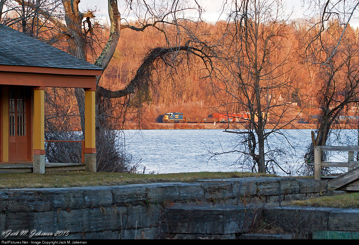 A CSX local rolls west along the Mohawk River as it heads to make a pick up in Fonda, NY as seen for the former Lock 28 on the Erie Canal.