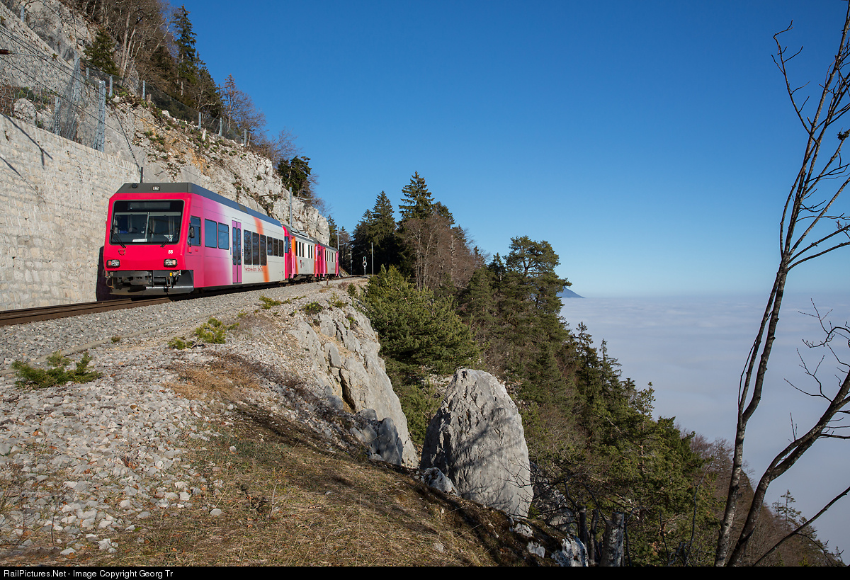 Cab car Bt # 55, electric railcar Be 4/4 # from 1981 and cab car Bt # 51 high above the sea of fog in the rocks near the small stop of Trois-Villes.