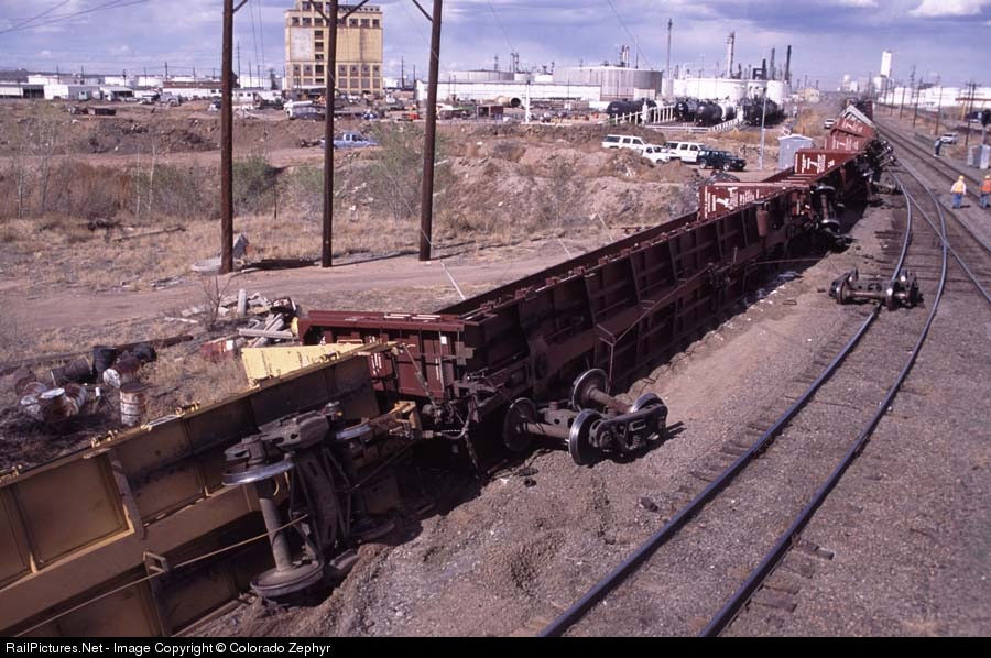 13-cars tipped over near front of train coming off Belt Line onto the Greeley line. View looks north towards front of train.