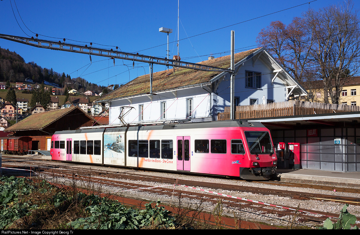 | Articulated lowfloor trainset Be 2/6 # 2000 of the YSteC Railway, built by Stadler Rail in 2001, in Ste-Croix station. |