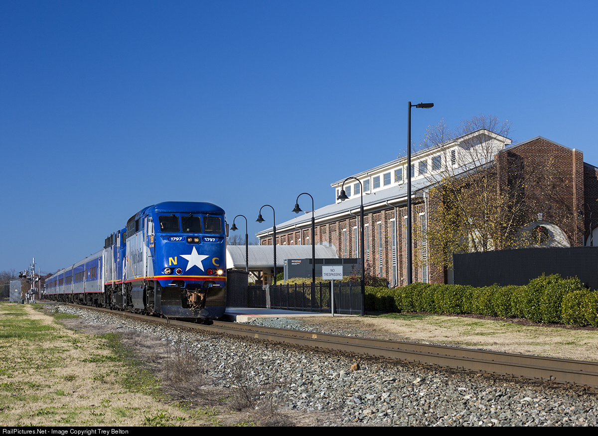 The RNCX 1797 stops for passengers in Burlington. The Station originally opened in 1868 as a large locomotive repair shop by the North Carolina Railroad. In 1895 the station was acquired by the Southern Railroad along with the North Carolina Railroad. It was restored to its current condition as a Station in 2003.